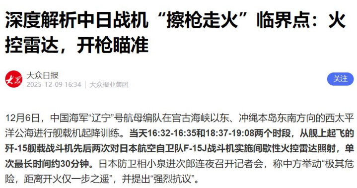 就在12月6日下午,辽宁舰上起飞的歼-15舰载机,对日本F-15J两次进行火控雷达照射,第二次更是高达30分钟,这不是警告了,这就是亮剑。