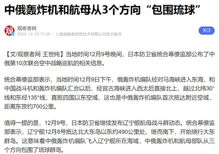 这是巧合?这显然是剧本。事实已经摆在眼前,中俄并不是冲着韩国去的,目标很明确,日本。而导火索,叫高市早苗。